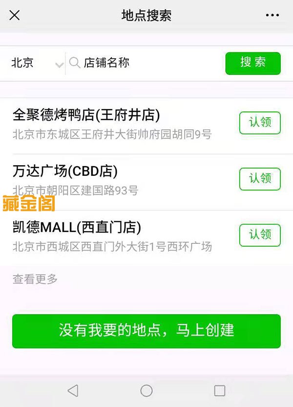 6、会打开“地点搜索”页面,选择店铺所在的城市,并输入店铺的名称,然后点击【搜索】,会显示地图中已存在的店铺,查看是否有你的店铺存在,如果有可点击【认领】,如果没有可点击【没有我要的地点,马上创建】,如下图。