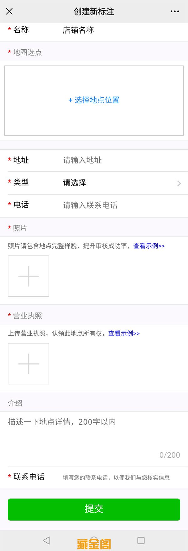 11、点击【照片】和【营业执照】中加号的地方,可现场拍照或上传已有照片。填写【联系电话】此电话是腾讯地图官方核实信息用的。