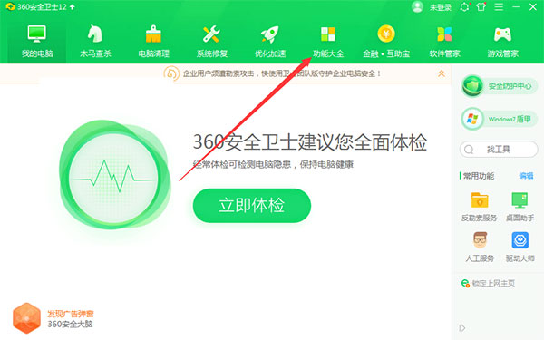 1、打开【360安全卫生】,点击【功能大全】。